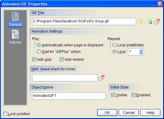 The GIF File field contains the name of the animation file to be played. Even though you’ve imported the file into your publication, it’s still an external file. Edit the file outside of VisualNEO Win and changes will automatically appear in your publication. The file will be bound inside the publication only during the Compile stage. To the right of the field are three small buttons: click the