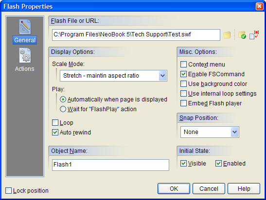 You can specify when the Flash content will start playing using the Animation Settings options. By default, the content will play Automatically when page is displayed. This is handy if you always want the content to play whenever its page is visible. Alternatively, you can have the content remain motionless and Wait for “FlashPlay” Action. The FlashPlay, FlashPause and FlashStop Actions can be used to control a Flash Player more precisely. Using these Actions, a Flash file can be started and stopped in response to a button click or as feedback for performing a task correctly. More information about these Actions can be found in here.