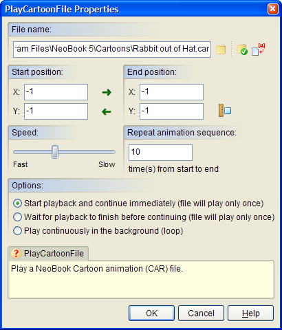 After you’ve selected a cartoon file, the PlayCartoonFile Properties screen will appear. Here you will specify where on the page the cartoon will be displayed, how fast the animation plays, and how long the animation will play.
