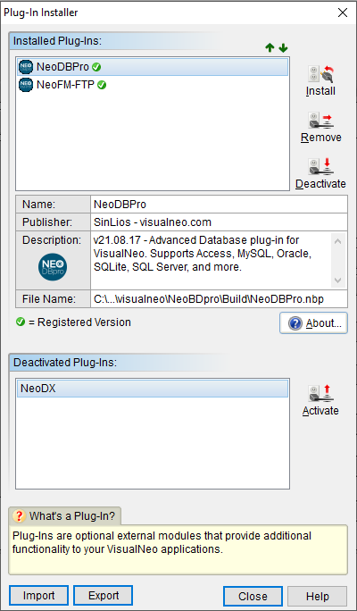 To remove the plug-in, highlight the plug-in’s name in the Installed Plug-In list and click Remove. This will completely remove any functions associated with the plug-in from VisualNEO Win. Any files associated with the plug-in still will be present on your hard drive. You will need to use the Windows Explorer or the plug-in vendor’s un-install utility to remove the files. Be careful not to remove any files belonging to other plug-ins or programs.
