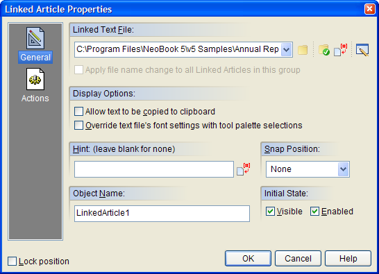 The Text File field contains the name of the file displayed in the Article object. Even though you’ve imported the file into your publication, it’s still an external file. Edit the file outside of VisualNEO Win and the changes will appear in your publication. Only during the Compile stage will the file be bound inside the publication. To the right of the field are four small buttons: click the