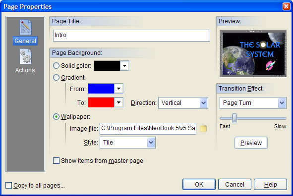 Use this command to change the attributes of the current page. The Page Properties screen is divided into sections indicated by the icon images on the left. General, Actions and (for 256 color publications) Palette. To view the settings for a section, click the corresponding icon.