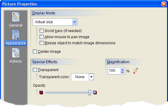 The Picture Properties screen is divided into three sections indicated by the icon images on the left: General, Appearance and Actions. To view the settings for a section, click the corresponding icon.