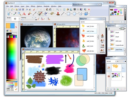 Some of PixelNEO's many powerful features include: support for popular image formats like JPEG, JPEG 2000, GIF, PCX, TIFF, BMP, ICO, CUR, PSD, PNG and numerous RAW formats; integrated support for scanners and digital cameras; professional quality output to any Windows compatible printer; multiple undo levels; layers; alpha channel transparency; dozens of special effects and textures; gradients; custom paint brushes; photo retouch and color correction tools; high quality color and format conversion; levels/histogram adjustment; masking; red-eye removal; tooth whitening; cloning; Stamp Pad; 3D objects; color separation; Picture Browser with file management tools; built-in Screen Capture; and dozens of other tools and options. PixelNEO also includes some fun natural media tools like charcoal, crayon, chalk, watercolor, fountain pen and more. You can even create your own custom paint brushes.