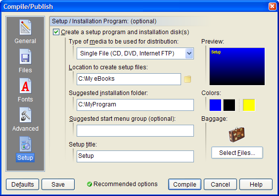 Make a selection from the Type of media to be used for distribution list to specify how your setup files will be packaged. Available options include Single File or 1.44MB, 720K and 1.2MB diskettes. The single file option is preferred if you intend to distribute your publication on CD-ROM or over the Internet. Select the appropriate diskette type if you need your setup program broken down into multiple disk-sized pieces.