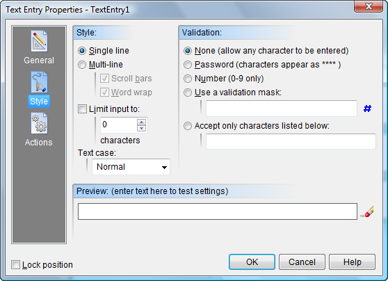 The Preview shows you what your Text Entry object will look like and can be used to test any masks you create.